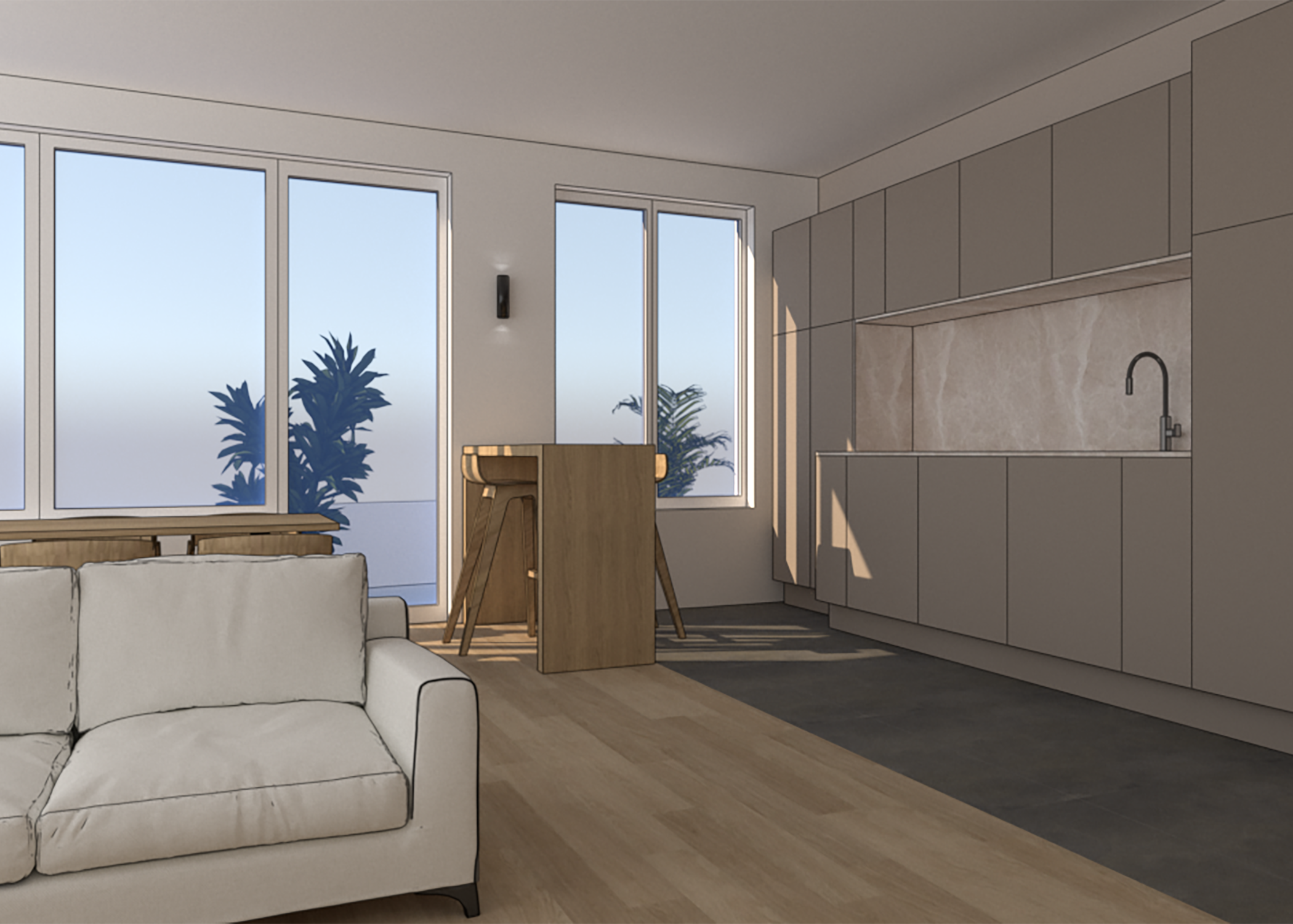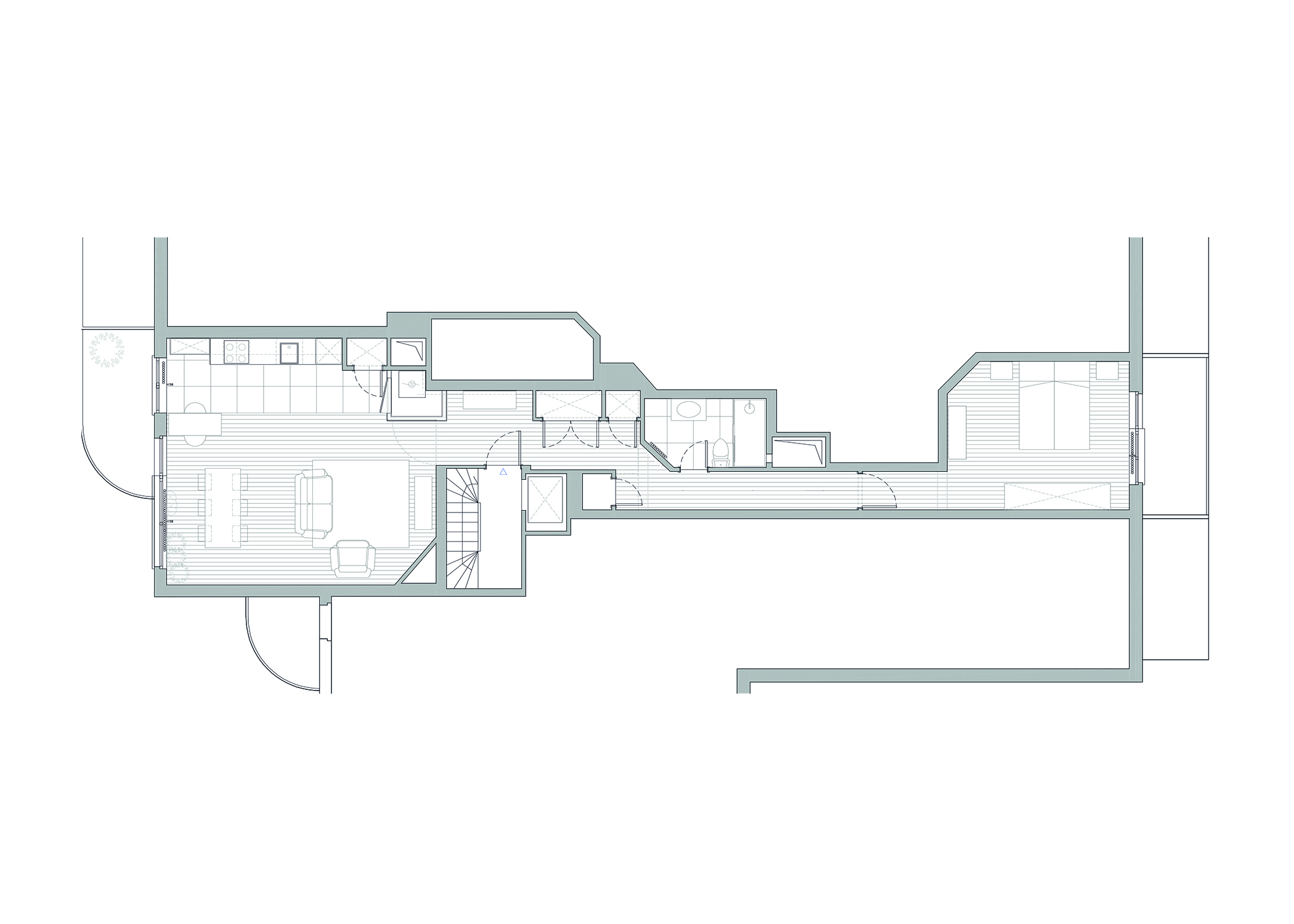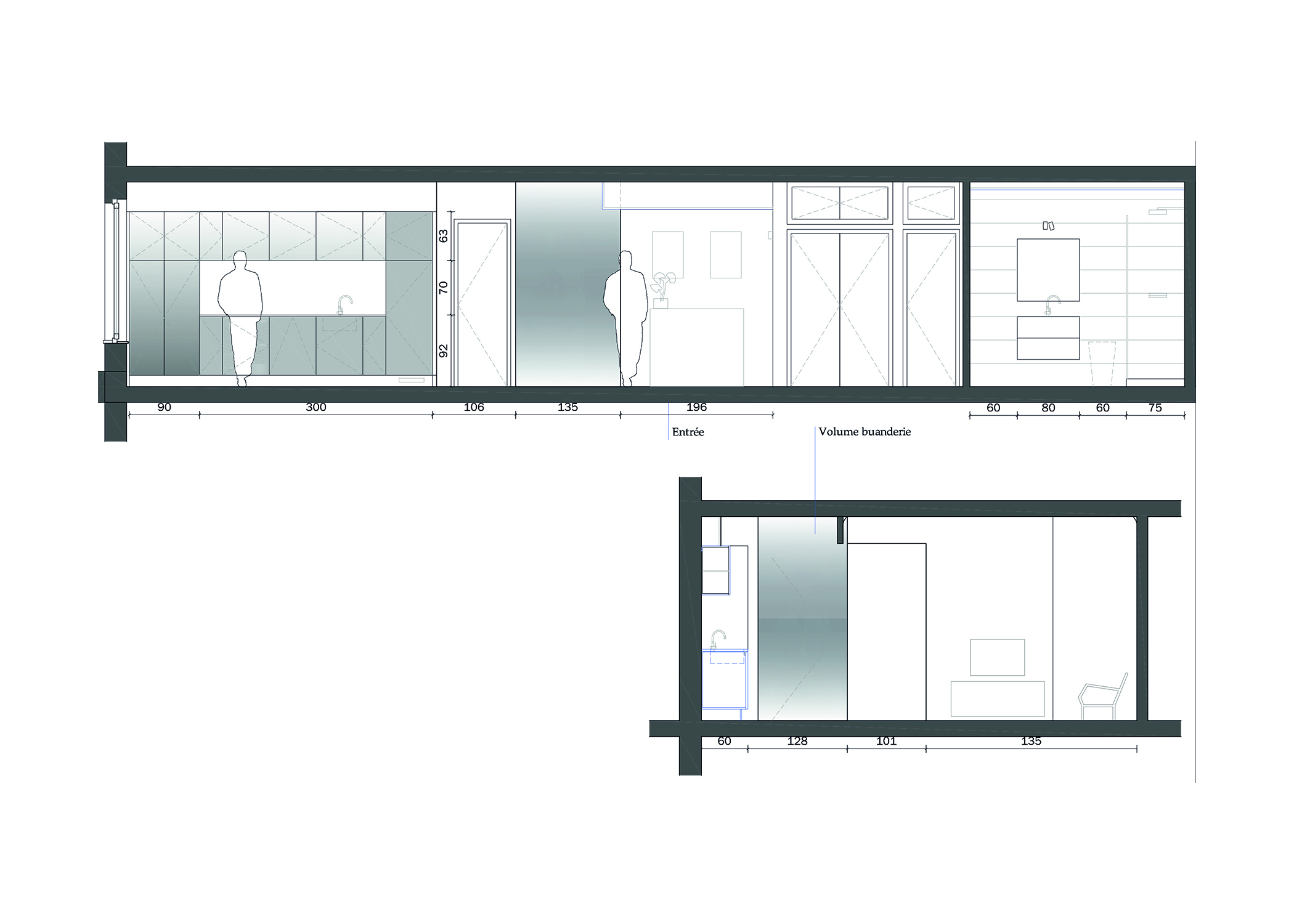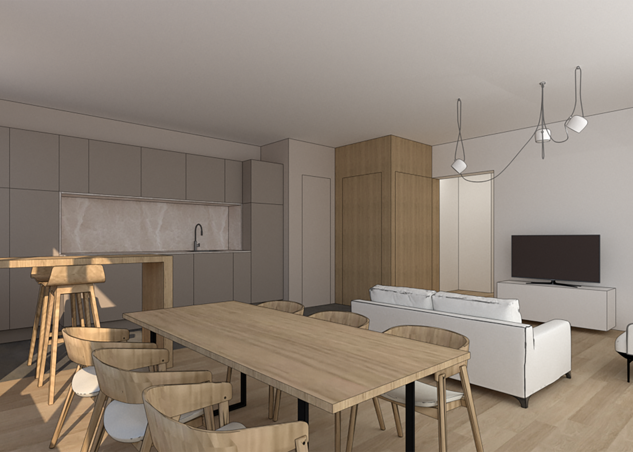 Un appartement situé au dernier étage d’un bâtiment près d’un parc à Bruxelles, une magnifique vue sur l’étang. Le propriétaire souhaitait le rénover entièrement et valoriser la lumière. Le projet uniformise les revêtements des surfaces, réduit les angles en biais et essaye de valoriser la lumière naturelle en utilisant des couleurs claires et neutres. Ce projet n’a pas été réalisé.