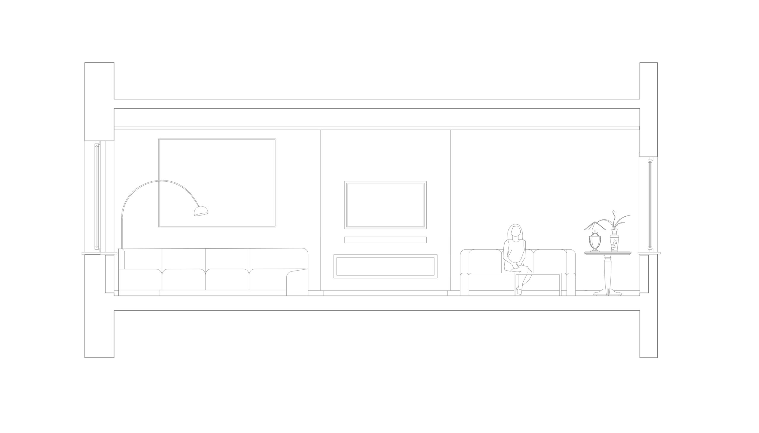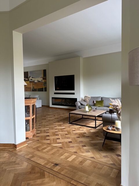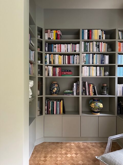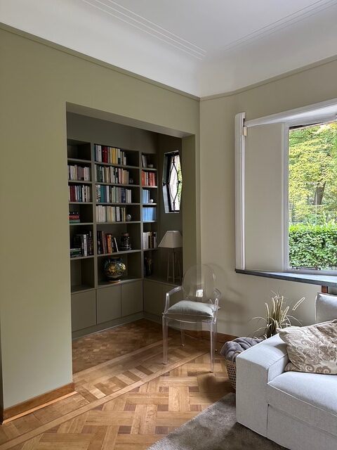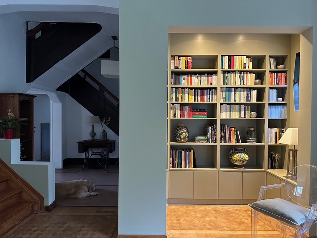 Dans une maison art déco, les clients souhaitaient revoir l’agencement de l’espace de leur zone jour, salon et salle à manger. Avec ce projet, nous avons essayé de valoriser les grandes surfaces à disposition en créant des zones du salon, différenciées mais au même temps liées entre elles. Les objets et les couleurs chaudes ont étés conservés avec le rajout d’une palette verte plus fraiche. La bibliothèque est dessinée sur mesure, comme aussi le coin télévision et feu électrique.